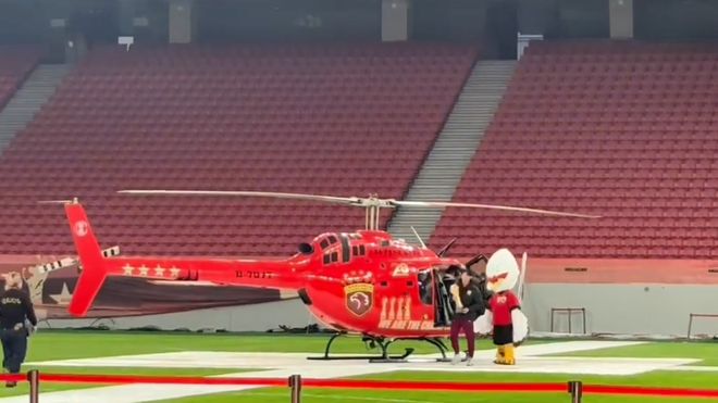 当直升机慢慢接近,眼尖的球迷发现,这架直升机的机身上居然印着海港队徽(下图)。这一幕实在震撼人心。不知道这是不是海港俱乐部专属的直升机。俱乐部财力十足,足以让很多囊中羞涩的中超同行羡慕不已!