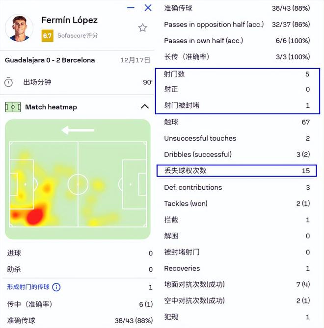 费尔明这场国王杯5次射门0射正,甚至说他过去5场比赛都是0射正,上一次费尔明射门打在门框范围之内,还要追溯到一个月之前与毕尔巴鄂竞技的那场比赛,当时球队4比0获胜。