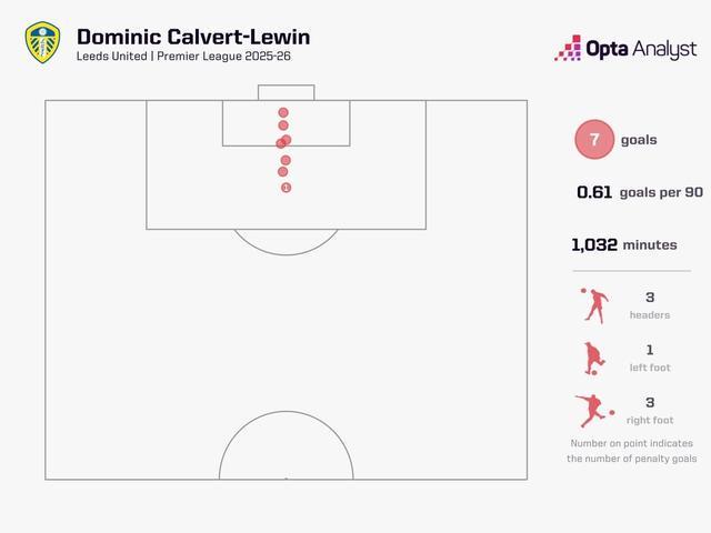 赛后Opta对卡尔弗特-勒温本赛季的英超进球进行了分析,赛季至今这名英格兰前锋代表利兹联在英超出场15次,其中11次首发,打进7球,合计出场时间1032分钟,平均每90分钟打进0.61球。